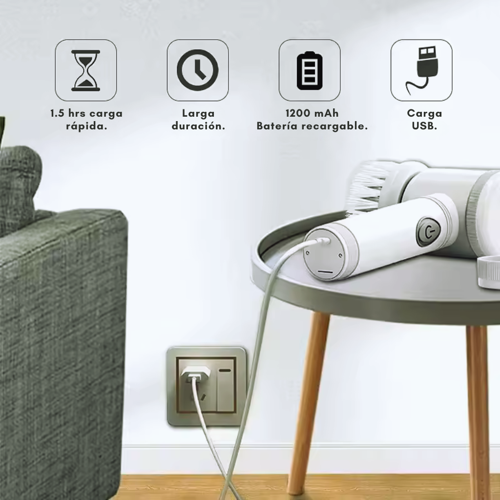 Olvídate de gastar en pilas. El SpinPro es 100% recargable e inalámbrico. Incluye su cable USB para que lo cargues fácilmente (como un celular). Una carga completa te da la potencia necesaria para varias sesiones de limpieza.